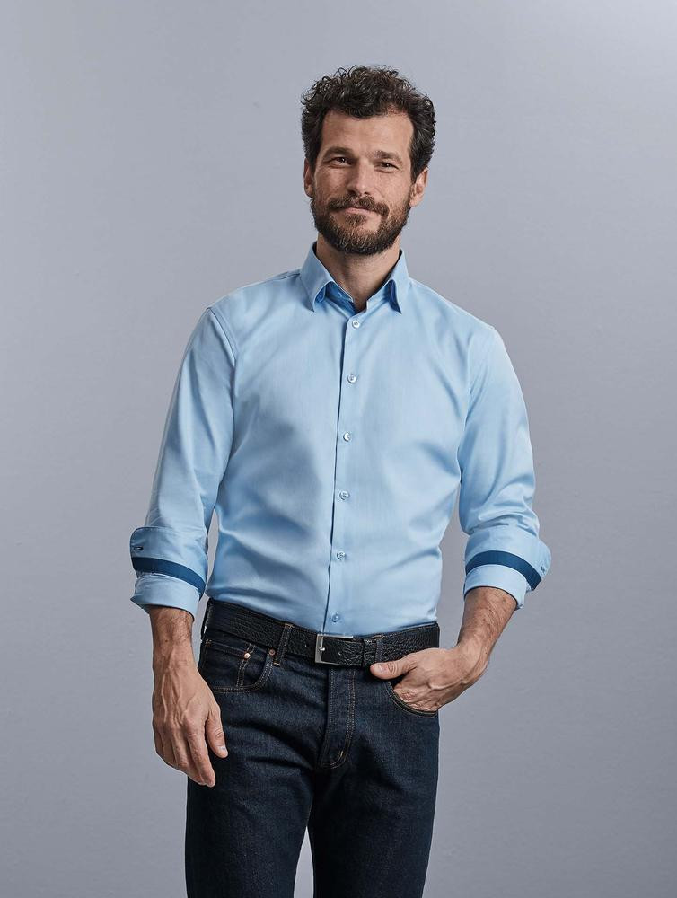 Classic button down shirt with an original twist: contrasted inside cuffs, collar and piping, and contrast edging around the lower button placket. The cuffs are rounded and adjustable. Elegant and nicely shaped, with darts at the back improving the fit.